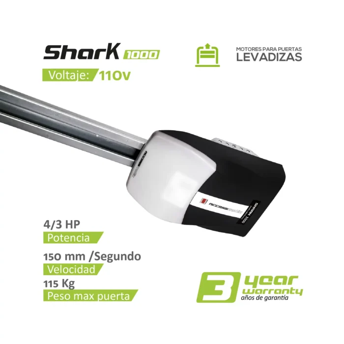 Motor Levadizo Shark 1000 para puertas seccionales o levadizas de 3/4 Hp de Fuerza con cargador de batería. Riel extensible hasta 5 metros. Uso residencial.